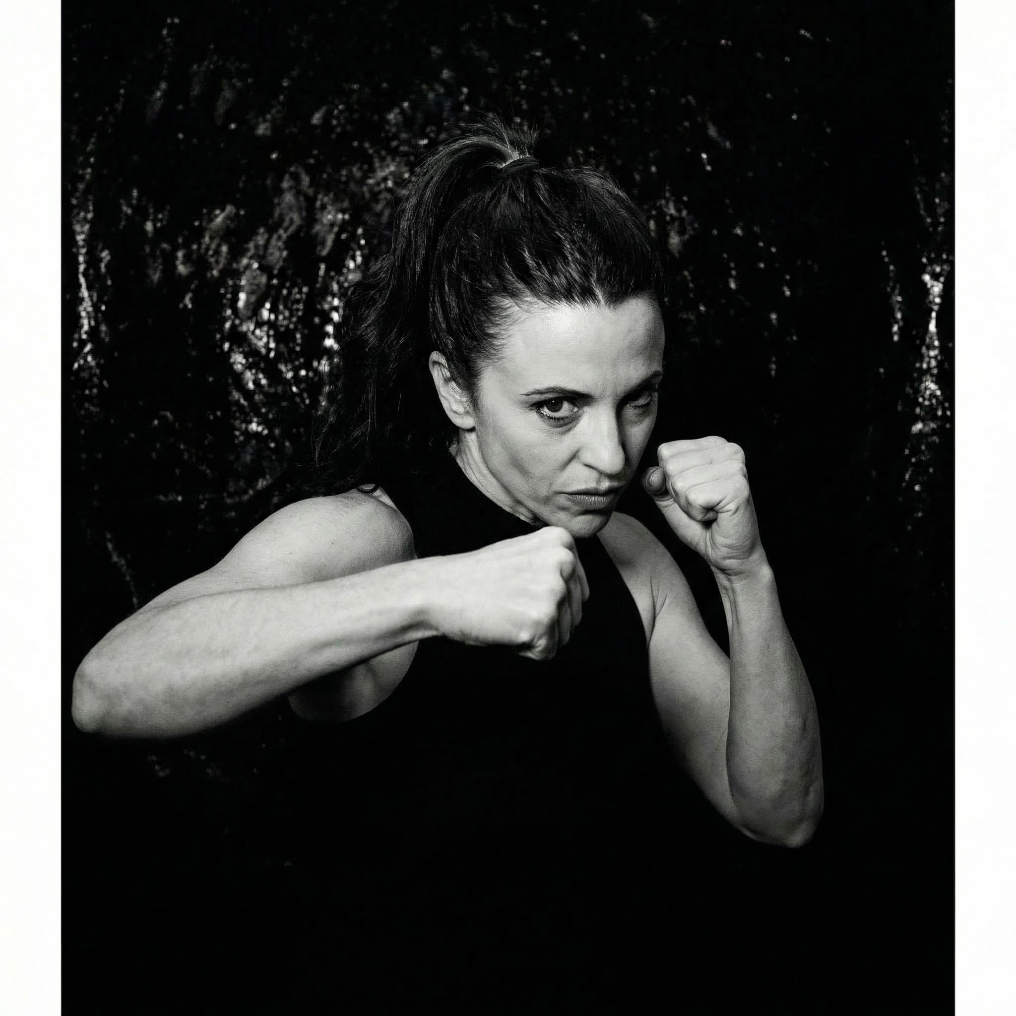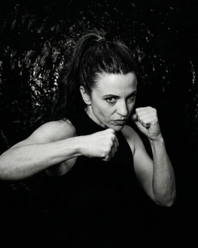 Open your legs and feel your feet firm in the ground. With your knees bent slightly, start punching the air. Allow the whole upper part of your body to move. Give your body freedom to express whatever